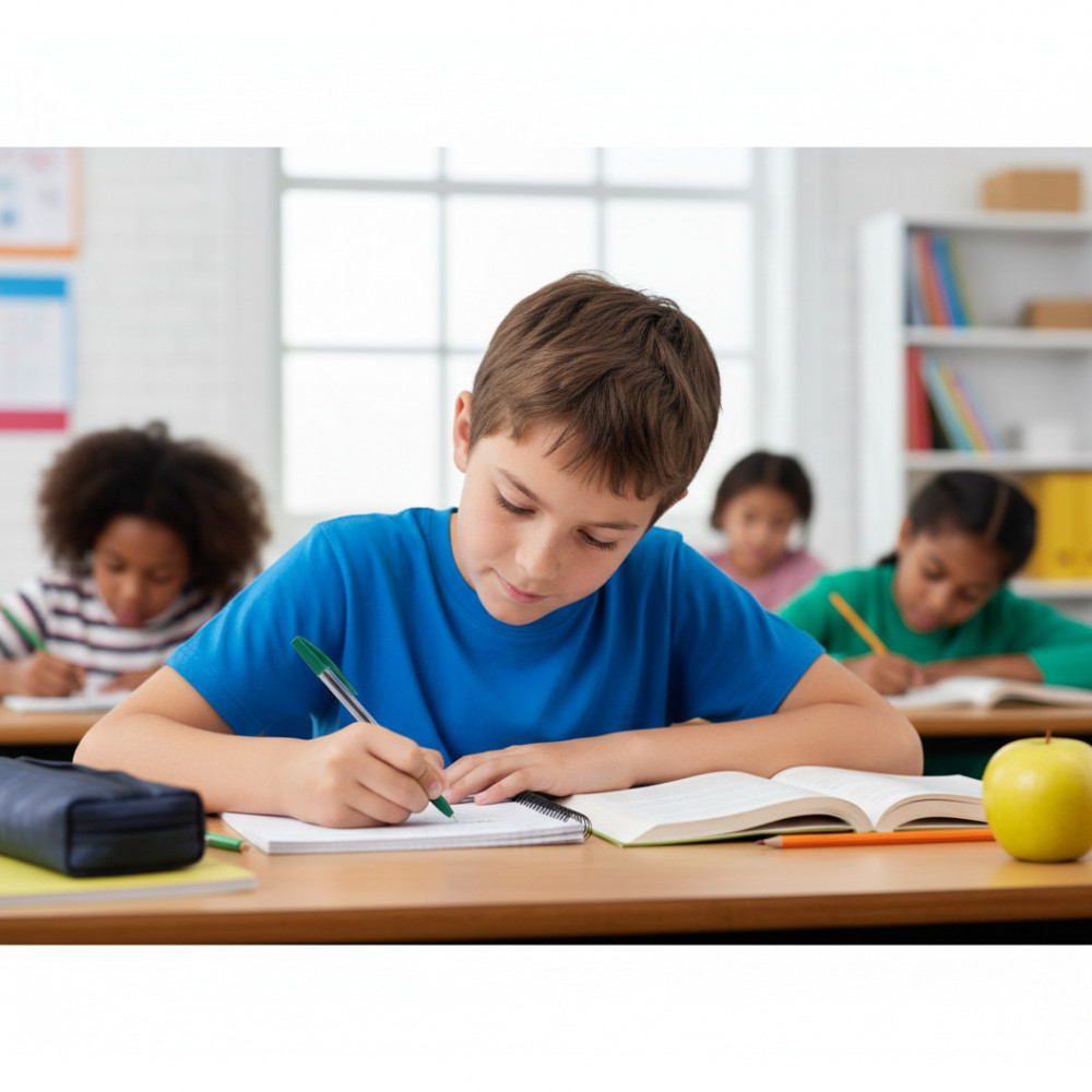 Organização por Código de Cores: Incentive seu filho(a) a usar a caneta verde para anotações específicas em uma disciplina, para listar tarefas importantes ou para fazer comentários em trabalhos. Isso cria um sistema visual claro que facilita a revisão.